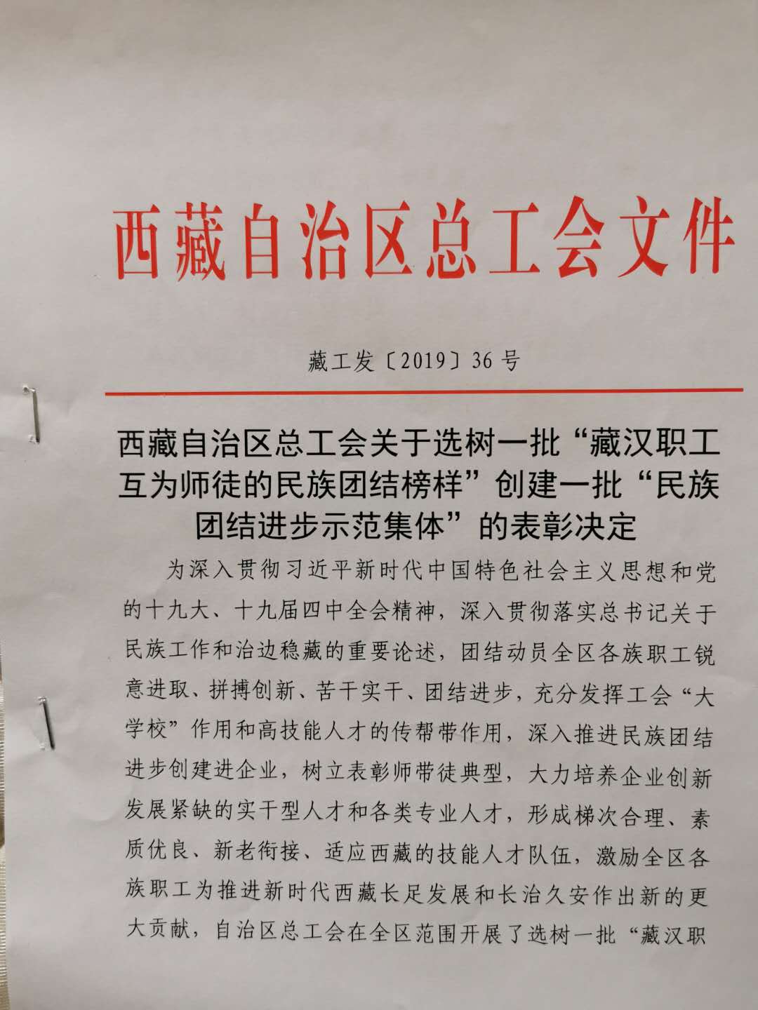 西藏自治區(qū)總工會關(guān)于選樹一批 "藏漢職工互為師徒的民族團結(jié)榜樣 "創(chuàng)建一批 "民族團結(jié)進步示范集體 "的表彰決定