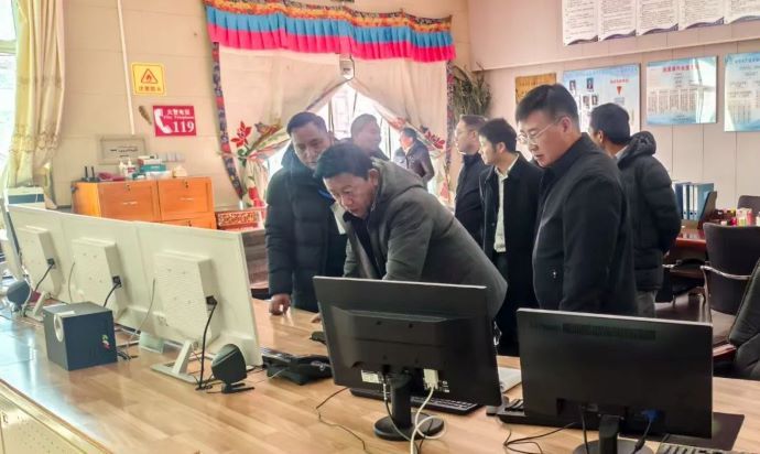 羅布次仁(左二)在滿拉水利樞紐工程調(diào)度室調(diào)研。