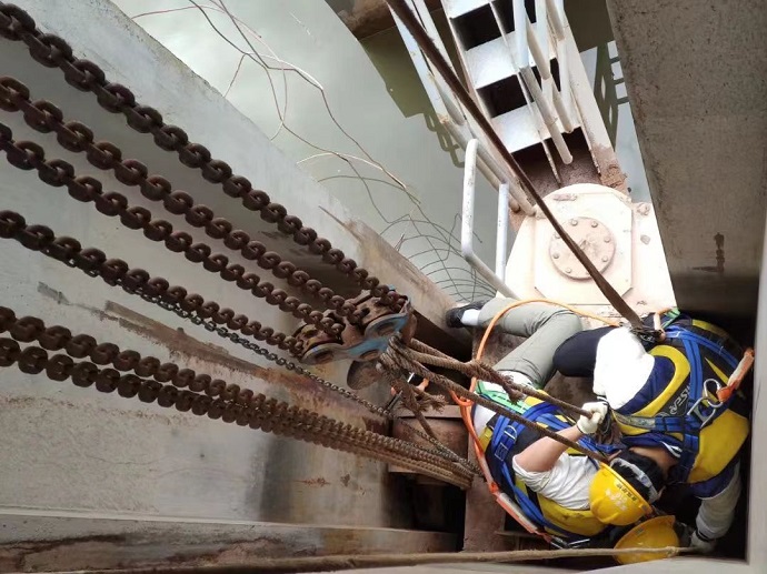 9月5日11時(shí)30分,果多水電站上游來水量突增,水庫攔污漂變浮箱無法及時(shí)上浮,導(dǎo)致大量垃圾飄進(jìn)進(jìn)水口區(qū)域,給機(jī)組運(yùn)行造成一定的安全隱患。吉克爾博接到部門安排后,馬上帶領(lǐng)兩名青年員工到浮箱上利用千斤頂、手動(dòng)葫蘆等工具開展處理。經(jīng)過分析、討論,判定攔污漂卡澀的原因?yàn)閷?dǎo)向輪長期受力不均發(fā)生變形,利用千斤頂反向作用力和手拉葫蘆的牽引力,最終將攔污漂卡澀問題解決。