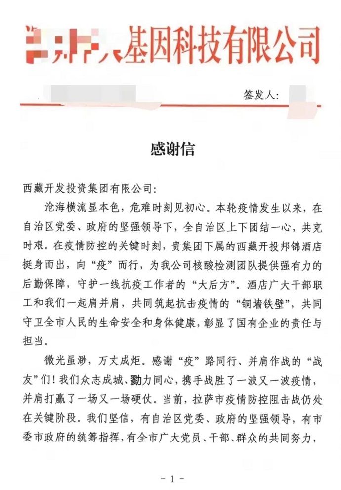 該核酸檢測機構(gòu)總部在感謝信中表示,本輪疫情發(fā)生以來,在自治區(qū)黨委、政府的堅強領(lǐng)導(dǎo)下,全區(qū)上下團結(jié)一心,共克時艱。在疫情防控的關(guān)鍵時刻,西藏開投邦錦花園酒店挺身而出,向“疫”而行,為該核酸檢測機構(gòu)的核酸檢測團隊提供強有力的后勤保障,守護一線抗疫工作者的“大后方”。酒店廣大干部職工和我們一起肩并肩,共同筑起抗擊疫情的“銅墻鐵壁”,共同守衛(wèi)全市人民的生命安全和身體健康,彰顯了國有企業(yè)的責(zé)任與擔(dān)當(dāng)。