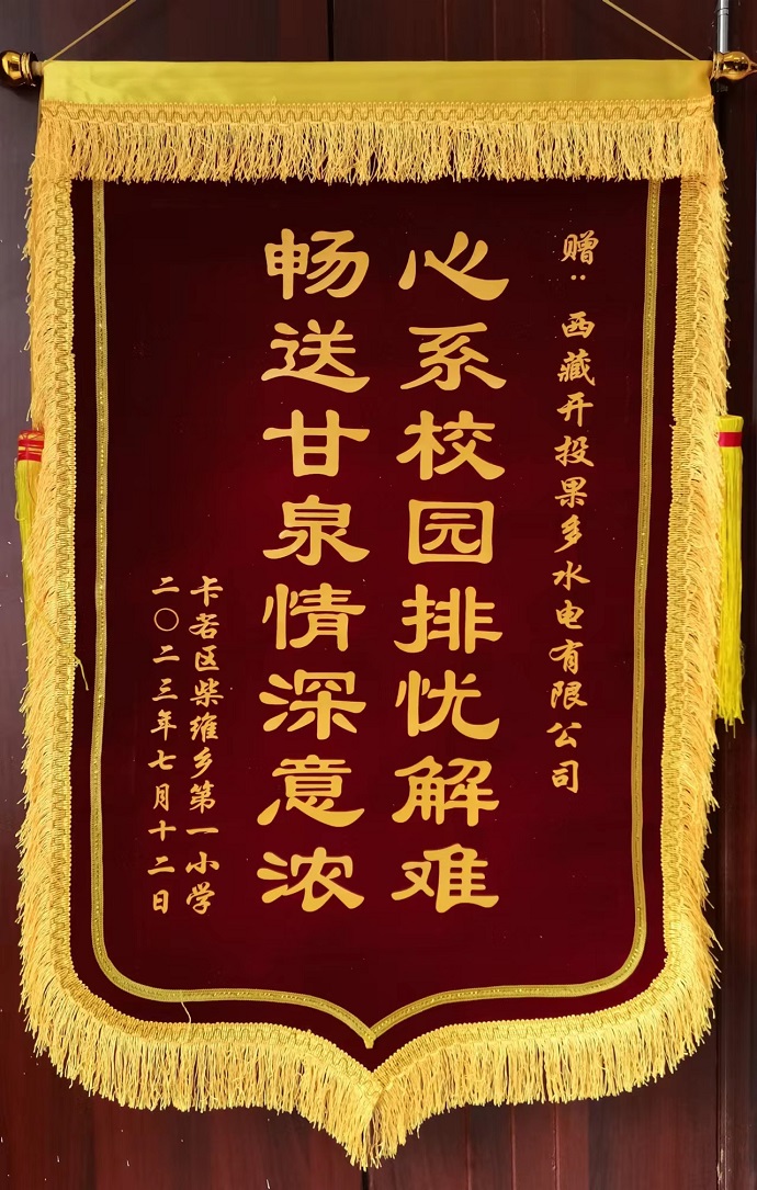 捐贈現(xiàn)場,果多水電公司董事長、總經(jīng)理宋亞東與校長李松林親切交流,了解孩子們學(xué)習(xí)、生活情況,鼓勵孩子們要好好學(xué)習(xí),保持樂觀向上的心態(tài),健康快樂成長。作為受助方,李松林向果多水電公司贈送“心系校園排憂解難 暢送甘泉情深意濃”錦旗以表謝意。他表示,愛心無價,情誼永恒,全校師生將把這份關(guān)愛化作砥礪前行的動力,努力提高柴維鄉(xiāng)教育教學(xué)質(zhì)量,培養(yǎng)出德、智、體、美、勞全面發(fā)展的新時代好少年。