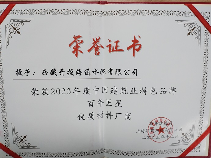 西藏開(kāi)投海通水泥公司榮獲中國(guó)建筑業(yè)特色品牌百年匠星優(yōu)質(zhì)材料廠商榮譽(yù)稱號(hào)