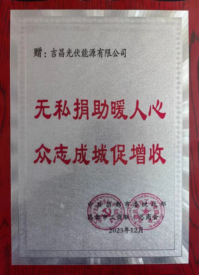 4月26日,中共昌都市委統(tǒng)戰(zhàn)部、昌都市工商聯(lián)(總商會(huì))聯(lián)合授予西藏開投吉昌光伏能源有限公司“無(wú)私捐助暖人心 眾志成城促增收”榮譽(yù)獎(jiǎng)牌,對(duì)公司充分發(fā)揮典型示范帶動(dòng)效應(yīng),有效增強(qiáng)“萬(wàn)企興萬(wàn)村”促增收、“百企幫百戶”等活動(dòng)影響力和凝聚力,為昌都市鄉(xiāng)村振興貢獻(xiàn)企業(yè)力量予以肯定和鼓勵(lì)。