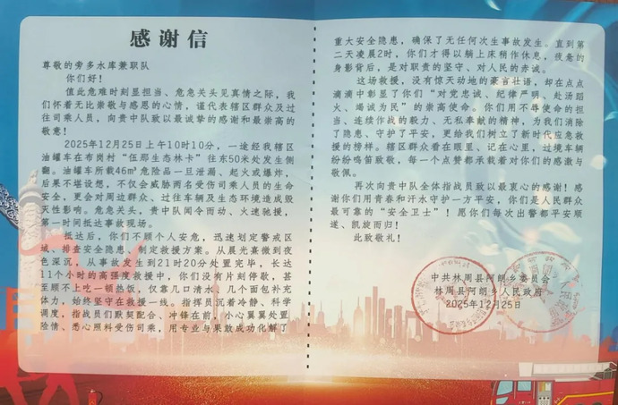 近日,西藏開投旁多水電公司兼職消防隊(duì)獲林周縣阿朗鄉(xiāng)黨委、政府授予的錦旗與感謝信,表彰其在一起?;愤\(yùn)輸車輛側(cè)翻事故救援中的突出貢獻(xiàn)。