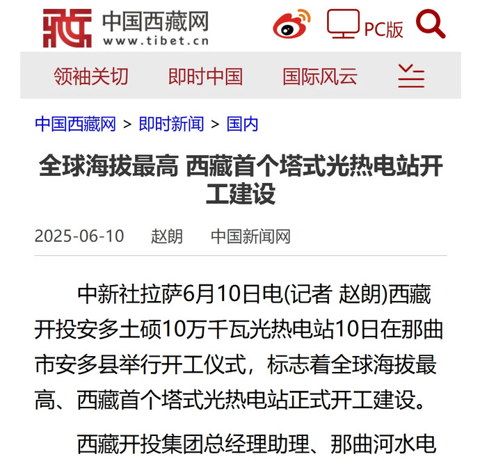 媒體報(bào)道丨全球海拔最高、西藏首個(gè)塔式光熱電站開(kāi)工建設(shè)
