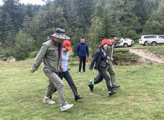 座談結(jié)束后,全體黨員面向黨旗莊嚴(yán)宣誓,重溫入黨誓詞,激勵永葆入黨初心。最后,兩支部開展了以“重溫紅色”為主題的戶外團(tuán)建活動,通過重走長征路、黨建知識問答、紅色詞匯你比我猜、兩人三足等活動進(jìn)一步增進(jìn)支部交流互動?;顒蝇F(xiàn)場,參賽隊(duì)員充分發(fā)揚(yáng)團(tuán)隊(duì)精神,積極參與,精誠合作,加油聲、吶喊聲、歡呼聲此起彼伏。