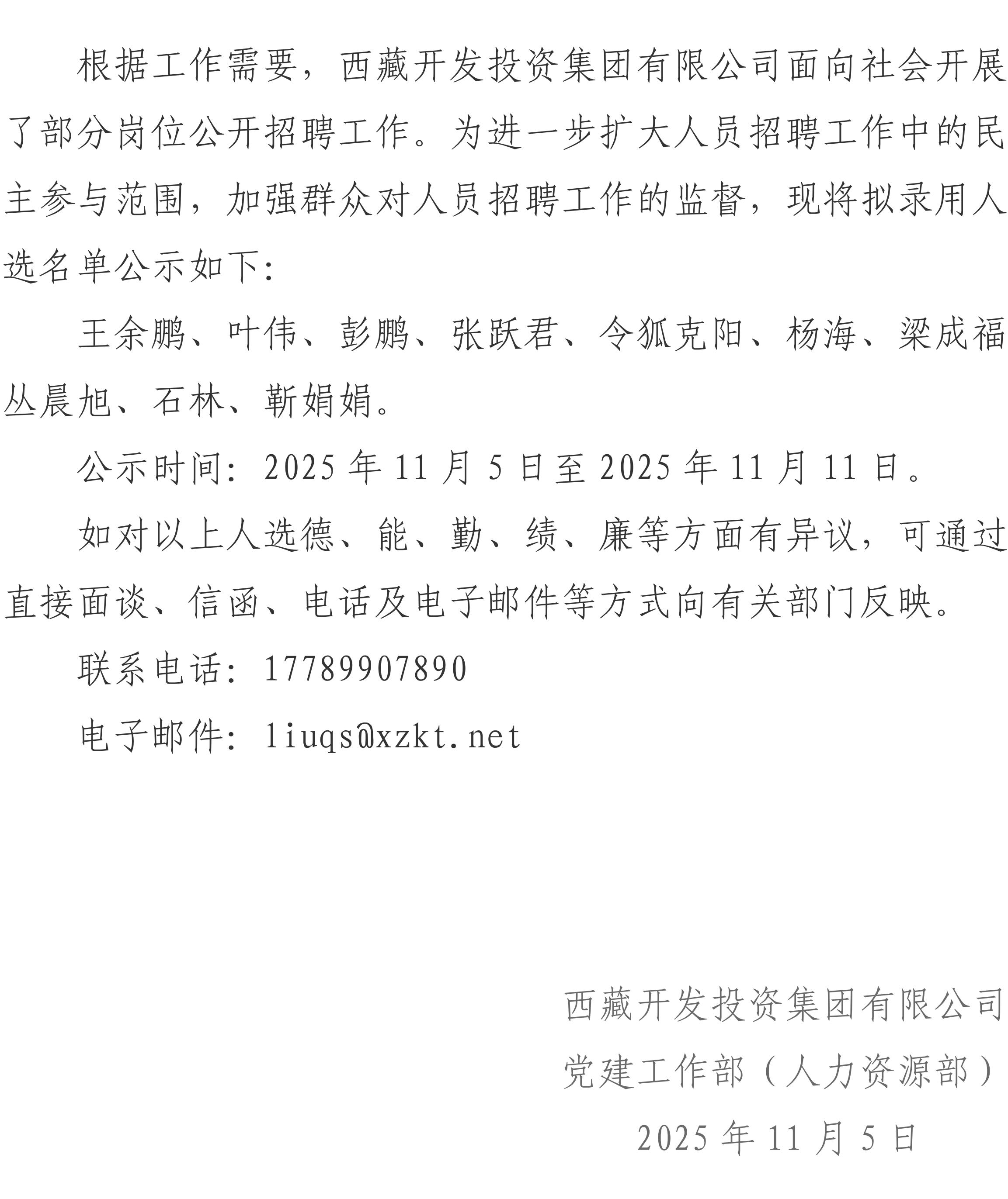 西藏開發(fā)投資集團(tuán)有限公司2025年滾動招聘擬錄用人員公示