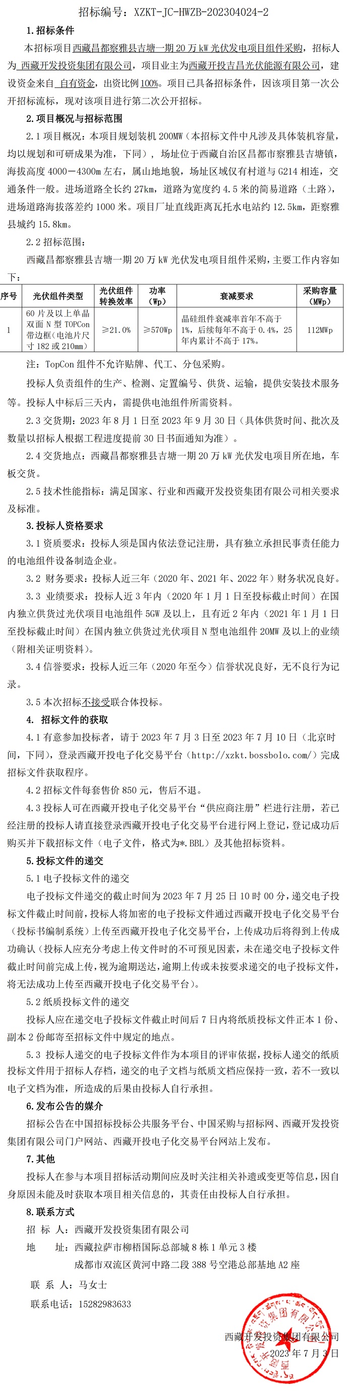 西藏昌都察雅縣吉塘一期20萬kW光伏發(fā)電項目組件采購