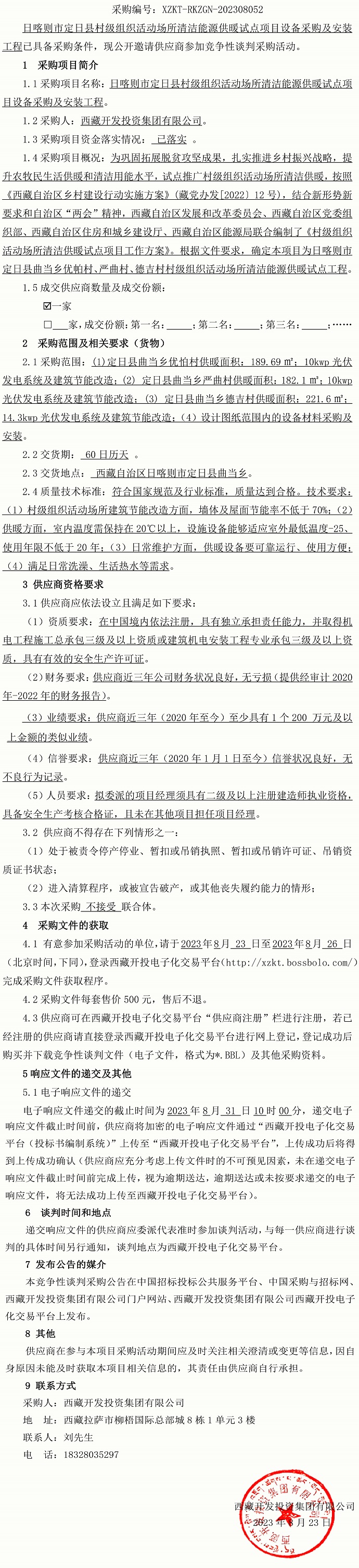 日喀則市定日縣村級(jí)組織活動(dòng)場(chǎng)所清潔能源供暖試點(diǎn)項(xiàng)目 設(shè)備采購(gòu)及安裝工程競(jìng)爭(zhēng)性談判采購(gòu)公告