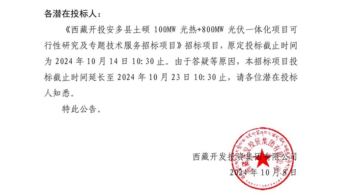 關(guān)于延長(zhǎng)《西藏開(kāi)投安多縣土碩100MW光熱+800MW光伏一體化項(xiàng)目可行性研究及專題技術(shù)服務(wù)招標(biāo)項(xiàng)目》投標(biāo)截止時(shí)間的公告