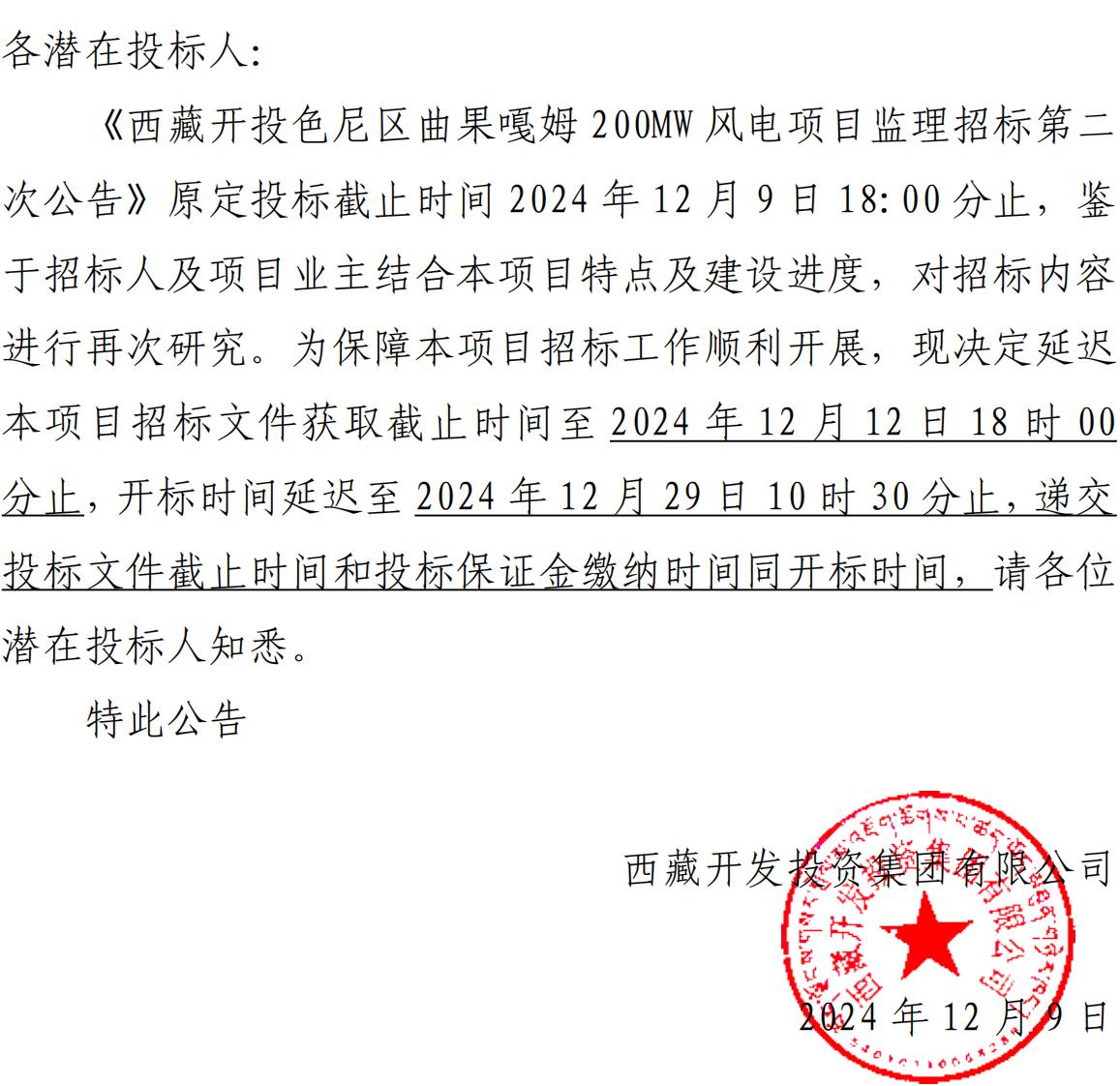 關(guān)于延長(zhǎng)《西藏開(kāi)投色尼區(qū)曲果嘎姆200MW風(fēng)電項(xiàng)目監(jiān)理招標(biāo)第二次公告》投標(biāo)截止時(shí)間的公告