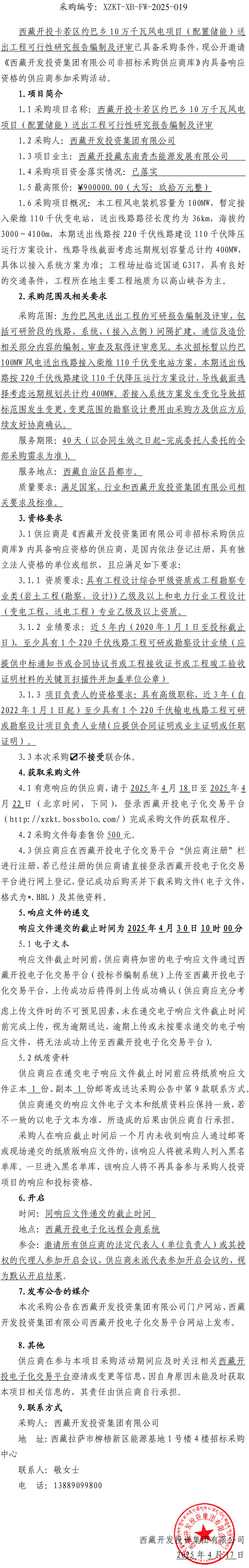 西藏開(kāi)投卡若區(qū)約巴鄉(xiāng)10萬(wàn)千瓦風(fēng)電項(xiàng)目(配置儲(chǔ)能)送出工程可行性研究報(bào)告編制及評(píng)審詢比采購(gòu)公告
