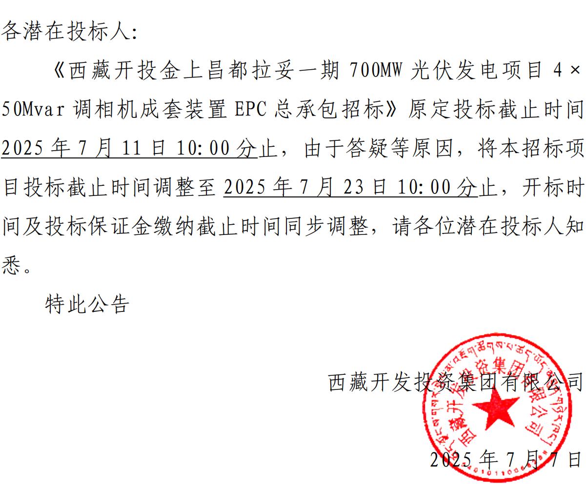 關(guān)于延長(zhǎng)《西藏開(kāi)投金上昌都拉妥一期700MW光伏發(fā)電項(xiàng)目4×50Mvar調(diào)相機(jī)成套裝置EPC總承包招標(biāo)》投標(biāo)截止時(shí)間的公告